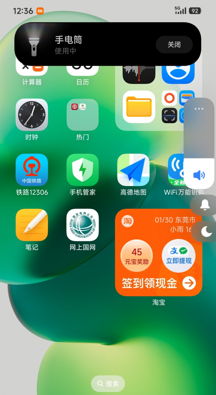 小米超级岛用着也挺好的,我常用的那个手电筒就很方便,打开电筒开关,控制界面就悬浮在手机桌面上,打开或者关闭都可以,这一点还是挺方便的。至于其它,我觉得图标的颜色有一点变化,比如说我的手机电量那里变成了全黑色了,5G信号那里也变成了黑色,原本这些都是白色的吧!