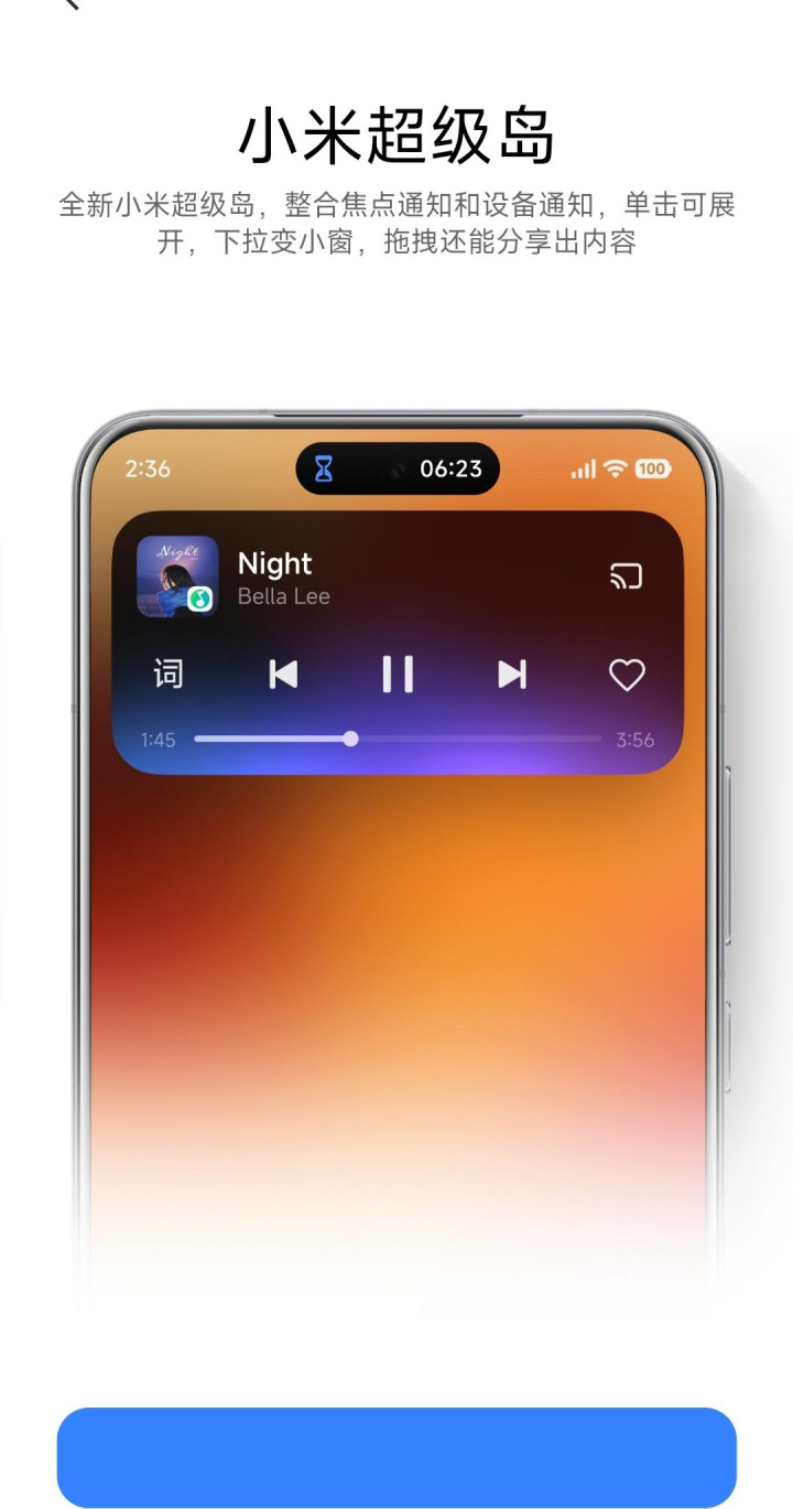 给我比较直观的感受就是多了一个小米超级岛,这功能还可以,我这样的老机型还是第一次有这功能,在前置摄像头位置浮现,可以整合焦点通知和设备通知,点击可展开,下拉也能变小窗,拖拽还能分享出内容。